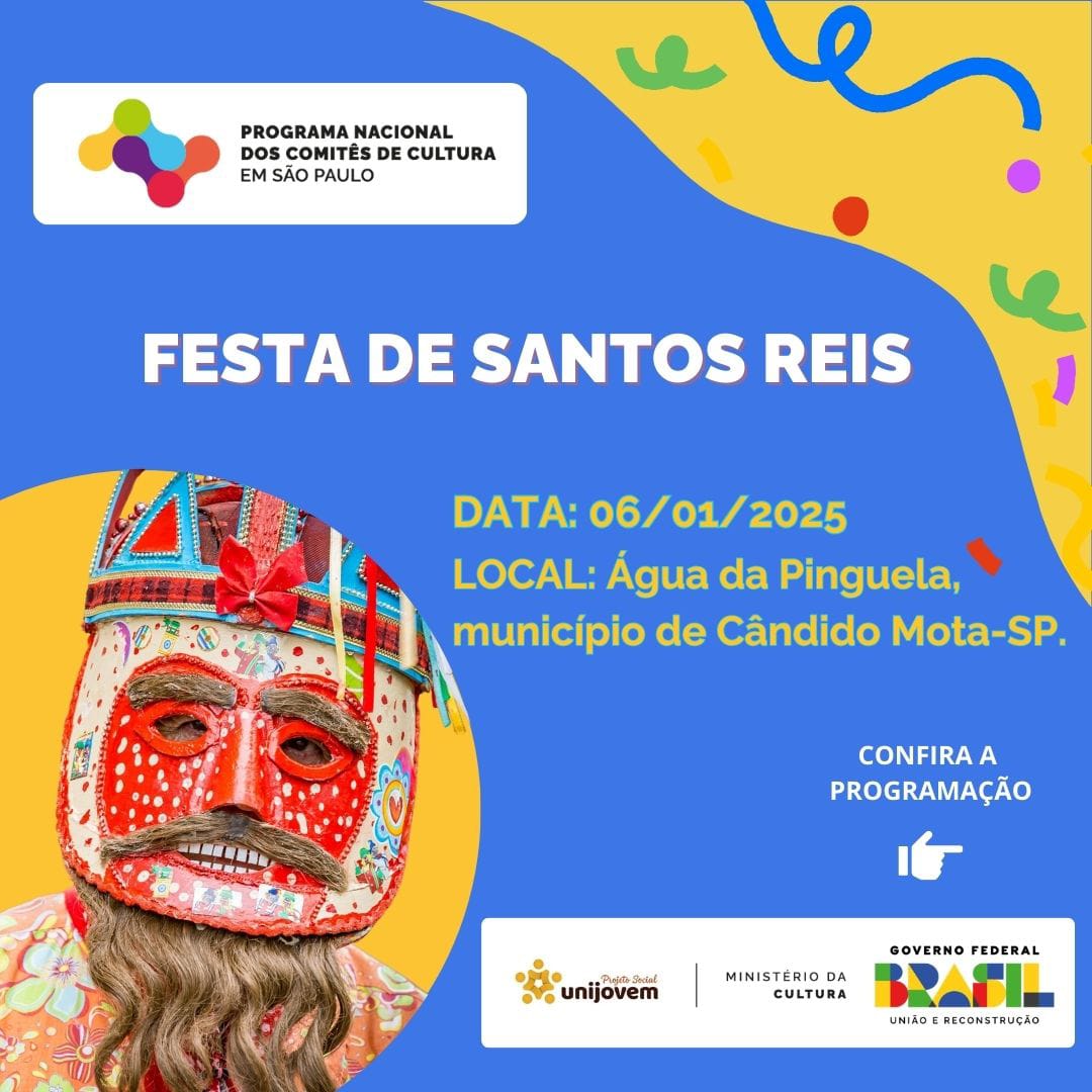 A tradicional Festa de Santos Reis acontecerá no dia 6 de janeiro de 2025, na Água da Pinguela, município de Cândido Mota (SP). Organizada pelos festeiros Irmãos Caetano (Clovis e Edson) e família, com o apoio PNCC- Plano Nacional de Comitê de Cultura, a festividade reúne fiéis em um evento marcado pela fé, tradição e confraternização.